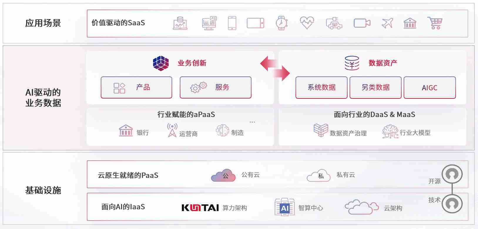 数字时代,,围绕企业数字化转型的关键要素,,,,z6com尊龙数码开创性的提出数云融合战略和技术体系框架,,着力在云原生、、数字原生、、AI原生和信创产业上架构产品和服务能力,,为处在不同数字化转型阶段的快消零售、、、、汽车、、、金融、、医疗、、政企、、、、教育、、、运营商等行业客户提供泛在的敏捷IT能力和融合的数据驱动能力,,,,构建跨界融合创新的数字业务场景和新业务模式,,,,助力企业级客户建立面向未来的核心能力和竞争优势,,全面推动社会的数字化、、智能化转型升级。。。